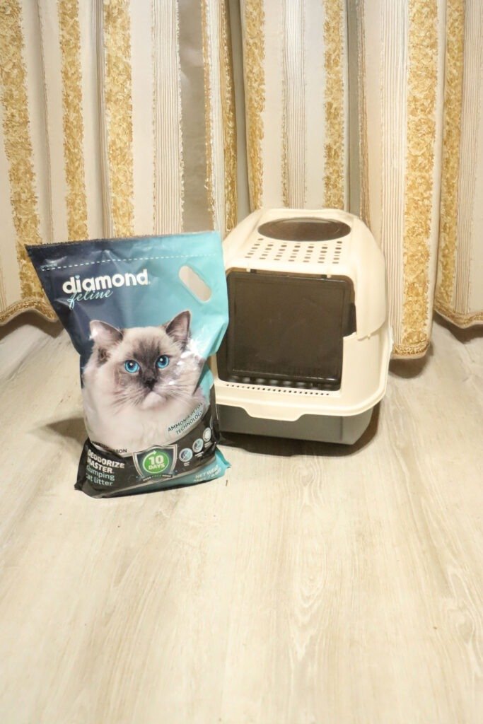 Llene la bandeja de arena con al menos 7cm de arena Diamond Feline®